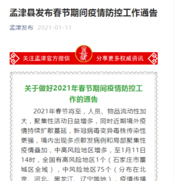 孟津縣關(guān)于做好2021年春節(jié)期間疫情防控工作的通告2021年春節(jié)將至,人員、物品流動(dòng)性加大,聚集性活動(dòng)日益增多,同時(shí)近期境外疫情持…